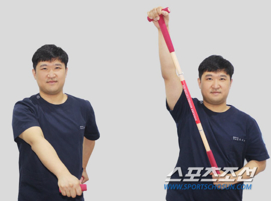 2. 긴 막대나 빗자루를 앞으로 잡고 아픈 어깨는 겨드랑이에 붙인 후 바깥쪽 안쪽으로 다른 팔로 밀어준다.