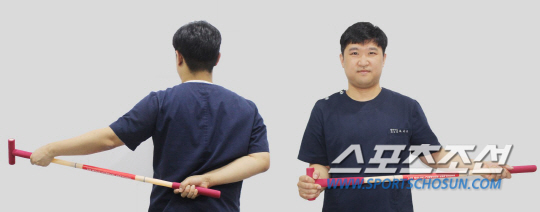 1. 긴 막대나 빗자루를 등 뒤로 잡고 아픈 어깨는 등 뒤에 붙이고 다른 팔로 막대나 빗자루를 당겨준다.