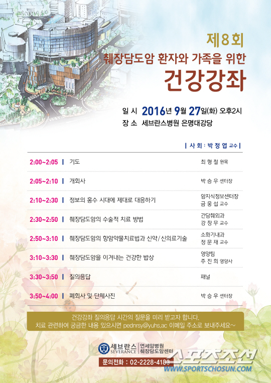 이날 건강강좌에서는 연세암병원 암지식정보센터 금웅섭 센터장이 넘쳐나는 건강 정보를 제대로 활용하는 방법에 대해 설명하고, 간담췌외과 강창무 교수가 췌장담도암의 수술적 치료에 대한 정보를 제공한다. 소화기내과 정문재 교수는 항암약물항암약물 치료법과 신약, 신의료기술에 대해 소개한다. 췌장담도암 환자를 위한 건강한 식단을 소개하는 시간도 마련돼 있다. 이번 건강강좌는 평소 환자와 보호자들이 궁금했던 질문들을 사전에 접수 받아 질의응답 시간을 통해 자세히 설명한다.
