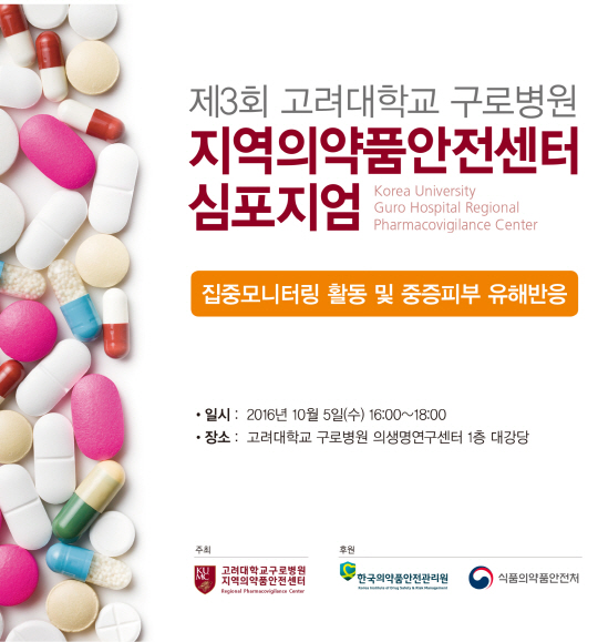 식품의약품안전처와 한국의약품안전관리원의 후원으로 진행되는 이번 심포지엄은 '집중모니터링 활동 및 중증피부 유해반응'을 주제로 모니터링 약물인 ▲진통소염제의 적절한 사용 - NSAID 및 Tridol(류마티스내과 김재훈 교수)과 ▲중증피부유해반응(SCARs) 소개 및 대상약물(피부과 전지현 교수) ▲고대 구로병원 집중모니터링 활동 소개(호흡기내과 허규영 교수) ▲사례를 통해 살펴 본 의약품부작용 피해구제(한국의약품안전원 이광정) 등의 강좌가 이뤄진다.