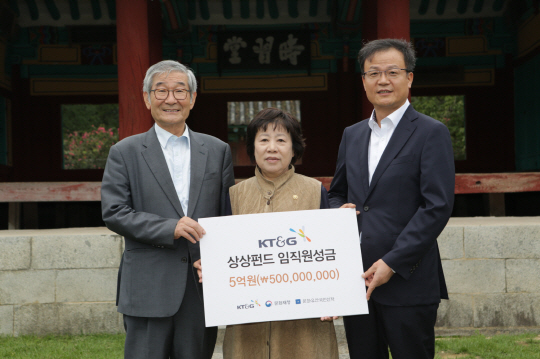 KT&G에 따르면 이날 경북 경주시 서악서원에서 백복인 KT&G 사장, 나선화 문화재청장 등이 참석한 가운데 '지진 피해 문화재 복구 지원 협약'을 체결하고 복구 기금을 전달했다. 문화재 복구 성금 5억원은 KT&G 임직원들이 참여해 만든 '상상펀드'에서 전액 마련됐다. 상상펀드는 임직원들의 자발적 성금에 회사가 같은 금액을 1:1로 매칭해 만든 KT&G만의 독특한 사회공헌기금이다.