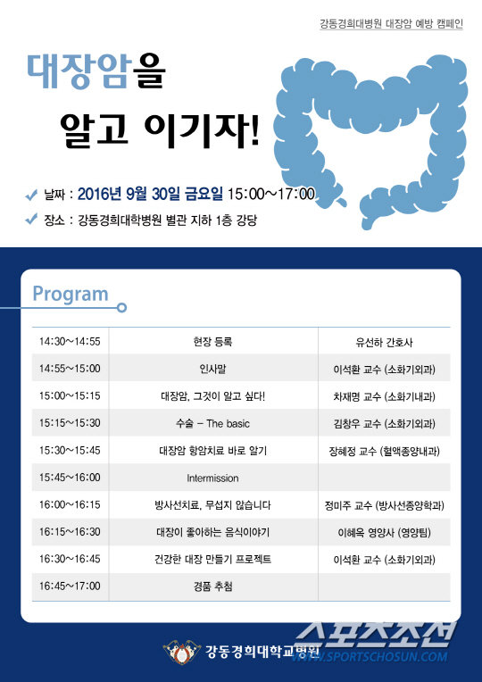 1부 강의 프로그램은 ▲'대장암, 그것이 알고 싶다'(내과 차재명 교수) ▲'대장암 수술의 기초'(외과 김창우 교수) ▲'대장암 항암치료 바로 알기'(혈액종양내과 장혜정 교수)로 진행된다. 이어서 2부에서는 ▲'방사선치료, 무섭지 않습니다'(방사선종양학과 정미주 교수) ▲'대장이 좋아하는 음식이야기'(영양팀 이혜옥 영양사) ▲'건강한 대장 만들기 프로젝트'(외과 이석환 교수)를 마지막으로 건강강좌를 마친다. 강연 후에는 참가자들에게 '대장이 좋아하는 과일' 등 소정의 경품을 제공한다. 관심 있는 사람은 누구나 사전 예약 없이 참석 가능하다. 김소형기자 compact@sportschosun.com