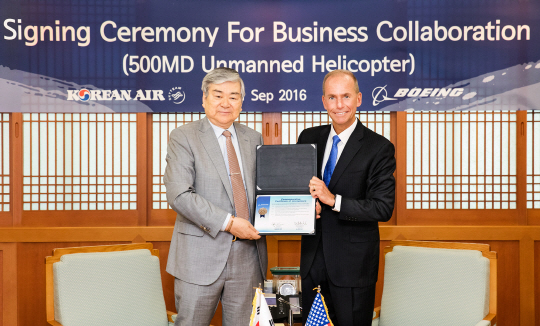 22일 대한항공에 따르면 지난 21일 서울 강서구 공항동 대한항공 본사에서 조양호 한진그룹 회장, 데니스 뮐렌버그(Dennis Muilenburg) 보잉 회장 등 양사 관계자들이 참석한 가운데 500MD 무인헬기 공동개발을 위한 합의각서(MOA, Memorandum of Agreement)를 체결했다.