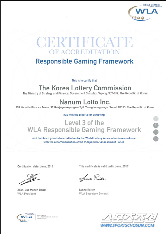 기획재정부 복권위원회와 복권통합수탁사업자 ㈜나눔로또(대표 양원돈)는 세계복권협회(WLA)로부터 건전화표준인증(RGF) 3단계를 취득했다고 22일 밝혔다.