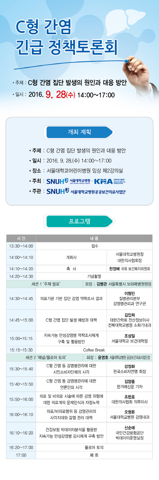 이번 토론회에서는 이형민 질병관리본부 감염병관리과 연구관이 '국내 의료기관 관련 C형간염 집단발생 역학조사 결과'를, 김인희 대한간학회 전산정보이사(전북대병원 소화기내과 교수)가 'C형간염 집단발생 예방과 대책'을, 조성일 서울대 보건대학원 교수가 '지속가능 만성감염병 역학조사체계 구축 및 활용방안'을 주제로 발표한다. 강정화 한국소비자연맹 회장, 김양중 한겨레신문 기자는 패널토의를 통해 C형간염을 비롯한 감염병 관리에 대한 시민소비자단체 및 언론인의 시각을 전달한다. 또한, 조현호 대한의사협회 의무이사가 '의료 및 비의료 시술에 따른 감염 위험에 대한 의료계의 문제의식과 자정노력'을 오명돈 서울대병원 감염내과 교수가 '의료·비의료행위 등 감염관리 사각지대와 대책'을, 신순애 국민건강보험공단 빅데이터운영실장이 '건강보험 빅데이터 분석을 활용한 지속가능 만성감염병 감시체계 구축방안'을 발표한다. 주제발표 후에는 참석자들이 C형간염 집단발생의 원인과 대응방안을 함께 고민하는 토론이 진행될 예정이다. 토론회는 서울대병원 공공보건의료사업단이 주관하며, 사전등록 없이 누구나 참석 가능하다.