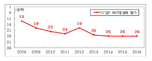 세계경제포럼 WEF가 매년 발표하는 국가경쟁력 평가 결과에서 한국이 138개국 중 26위를 차지했다. 이는 2014년, 2015년에 이은 3년 연속 최저 순위다.