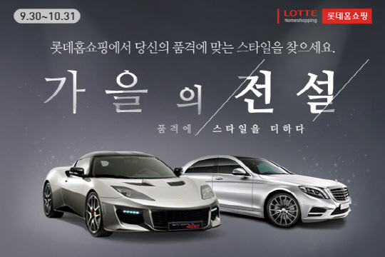 롯데홈쇼핑이 10월 말까지 진행되는 2016년 코리아 세일 페스타 기간동안 '가을의 전설' 이벤트를 진행한다. 29일 롯데홈쇼핑에 따르면 가을의 전설 이벤트는 한달간 응모고객 중 추첨을 통해 정통 스포츠카와 고급 세단을 비롯해 해외여행 상품권, 명품백 등이 경품으로 제공된다. '고객이 직접 선택한다'는 콘셉트로 진행되며 9월 30일부터 10월 31일까지 TV, 온라인, 모바일 등 전 매체를 통해 진행된다.
