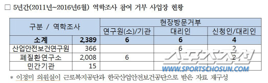 이 기간 실시된 역학조사는 2389건이며 이중 16개 사업장에서 신청인 또는 대리인, 심지어 기관의 방문조사조차 이뤄지지 않았다. 삼성전자와 협력업체가 8곳(44%)이나 됐다.