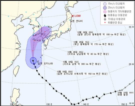 태풍 영향으로 5일까지 제주도와 전남 남해안, 경상해안을 중심으로 최대순간풍속 30m/s 이상의 매우 강한 바람과 함께 많은 비가 내릴 것으로 예상된다.