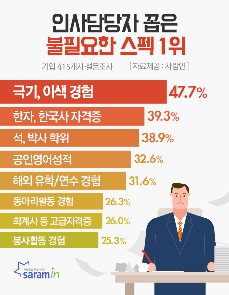 토익 고득점, 자격증 취득, 공모전 등 취업에 성공하기 위해 다양한 스펙 쌓기에 여념이 없는 구직자들이 많다. 하지만 기업 인사담당자들은 실제로 지원자들의 스펙 중 불필요한 스펙도 많다고 입을 모은다.