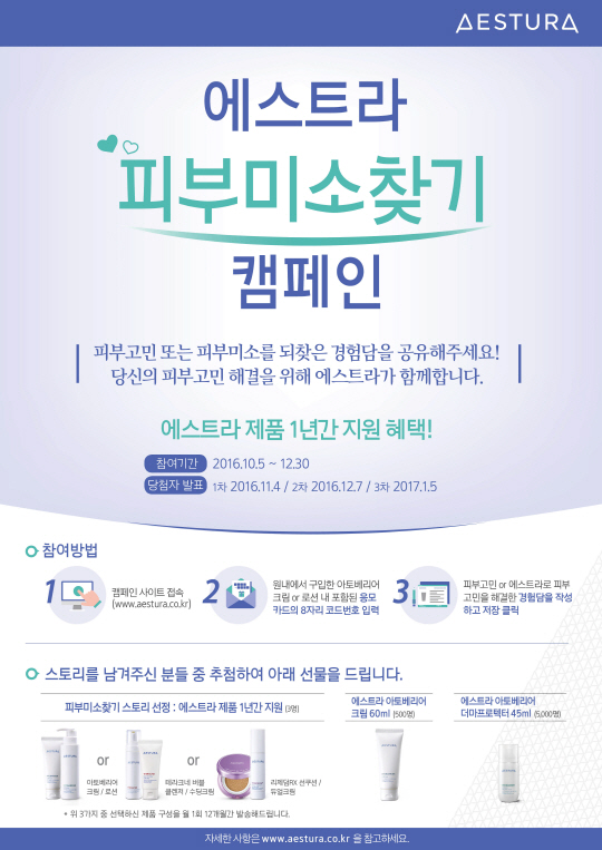 메디컬뷰티 전문기업 에스트라는 2016 에스트라 피부미소찾기 캠페인을 진행한다. 3년째 꾸준히 진행하고 있는 에스트라의 대표 캠페인으로 소비자들의 피부 고민이나 에스트라 제품으로 피부고민을 극복한 노하우를 공유한다. 이번달 5일부터 12월 30일까지 에스트라 아토베리어 대표 제품인 크림, 로션을 구매하는 고객들을 대상으로 진행되며, 응모카드의 코드번호를 캠페인 사이트 입력하면 참여할 수 있다. 에스트라 피부미소찾기 스토리로 선정된 3명에게는 피부 타입에 맞는 에스트라 제품을 1년간 지원하는 등 다양한 혜택이 주어질 예정이다.