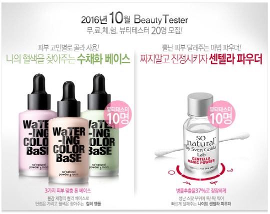 자연주의 피부과학 쏘내추럴이 10월 한 달간 신제품 워터링 컬러 베이스와 센텔라파우더를 체험해 볼 수 있는 뷰티 테스터 20명을 모집한다. 워터링 컬러 베이스는 핑크 그린 라벤더 3가지 피부 별 맞춤 컬러로 구성되어 있다. 기초 케어 성분을 함유한 촉촉한 워터 제형으로 오랜 시간 들뜸 없는 메이크업을 유지시켜주는 제품이다. 센텔라 파우더는 액상과 파우더 두 가지 제형으로 노폐물 및 각질을 케어와 피부 진정에 도움을 준다. 뷰티 테스터는 쏘내추럴 홈페이지의 이벤트 페이지에서 응모할 수 있다.