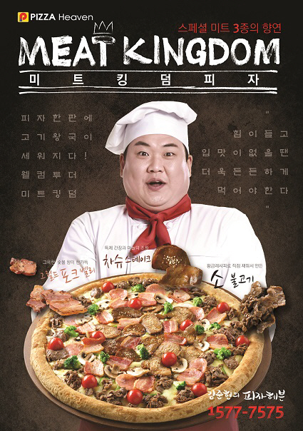 끝까지 맛있는 착한피자 피자헤븐은 '고기의 향연'이라는 주제와 어울리게 피자헤븐의 스페셜 미트 3종이 합쳐진 미트킹덤 피자를 선보였다. 피자 한판에 숯불향이 가득한 '그릴드 포크밸리', 황금레시피로 재워서 맛을 낸 '소불고기', 특제 간장과 마늘의 조화에 일본식 보쌈이 어우려진 '차슈스테이크' 등이 올려져 있다.