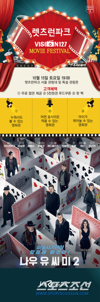 한국마사회는 세계 최대 크기의 전광판(경마장 기준) '비전127(VISION 127)' 설립을 기념, '무비 페스티벌'(Movie Festival)을 15일(토) 개최한다고 밝혔다. 상영 예정 영화는 인기리에 방영됐었던 '나우유씨미2(Now You See Me 2)로, 렛츠런파크 서울에서 오후 7시부터 방영된다.