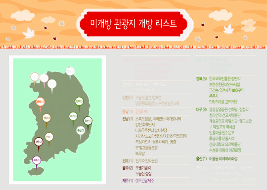 올가을 여행주간에는 2014년 여행주간 시작 이후 처음으로 유적지, 문화시설, 공공시설, 생태보전지역 등 미개방 관광지를 여행주간에 개방(개방시간 연장, 개방인원 확대 포함) 한다. 지자체, 민간, 유관 기관의 협조로 전국 26개 지역 40여 곳의 미개방 관광지가 열리는데, 이 중에는 보존 문제 등을 이유로 일반에게 한 번도 공개되지 않았던 곳도 있다.
