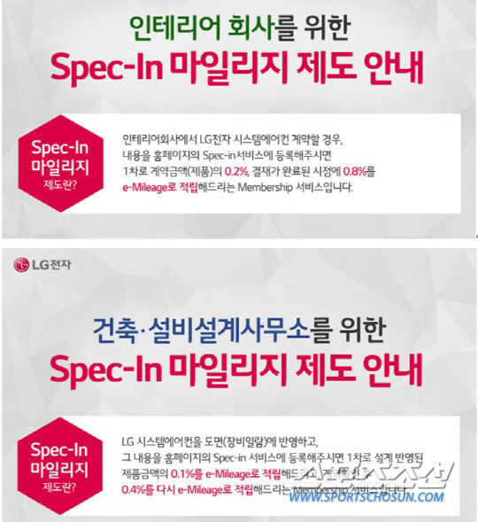 인테리어 회사의 경우 LG전자 시스템에어컨을 계약한 뒤 그 내용을 홈페이지의 Spec-in 서비스에 등록하면 1차로 계약금액(제품)의 0.2%, 결재가 완료된 시점에선 0.8%를 e-마일리지로 적립 받을 수 있다.