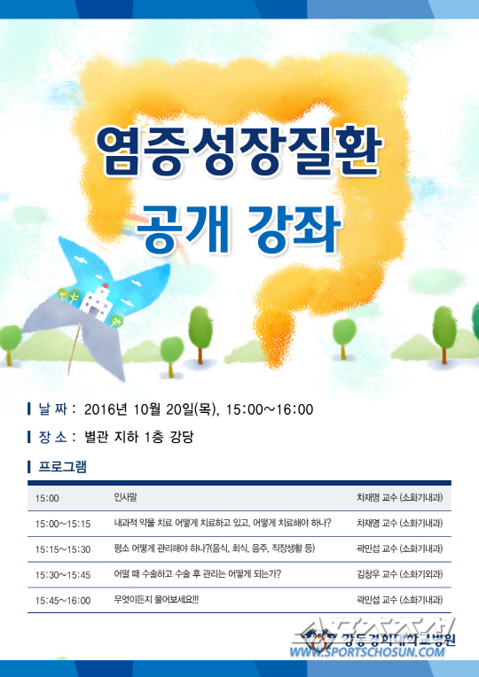 이번 건강강좌는 ▲내과적 약물 치료 어떻게 치료하고 있고, 어떻게 치료해야 하나(소화기내과 차재명 교수) ▲평소 어떻게 관리해야 하나(소화기내과 곽민섭 교수) ▲어떨 때 수술하고 수술 후 관리는 어떻게 되는가(소화기외과 김창우 교수) ▲무엇이든지 물어보세요(소화기내과 곽민섭 교수) 순으로 진행된다.