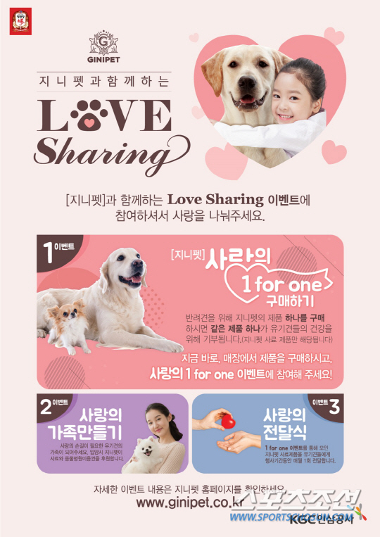 KGC인삼공사에서는 사회적 이슈가 되고 있는 '유기견'을 돕고자 '지니펫과 함께하는 러브 쉐어링' 이벤트를 진행한다고 밝혔다.