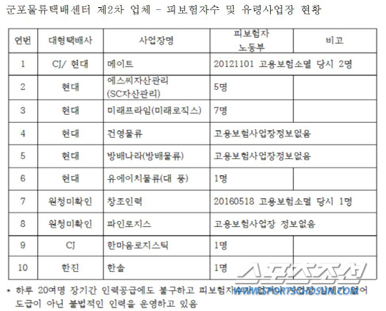 2차 업체들은 20여명 정도의 인력을 꾸준히 공급하고 있음에도 고용보험이 소멸 혹은, 사업장 정보가 없거나, 피보험자수가 0명인 업체가 다수 존재했다. 1차 도급업체들과 형식적 도급계약을 맺은 업체지만, 사실상 인력공급을 대가로 직업소개소처럼 수수료를 띄어가는 인력세탁이 이뤄지고 있던 셈이다.