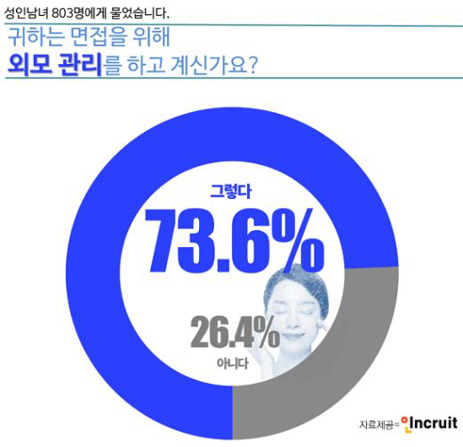 13일 취업포털 인크루트의 설문조사 결과에 따르면 구직자들의 73.6%는 면접을 위해 외모 관리를 하고 있다고 답했다.