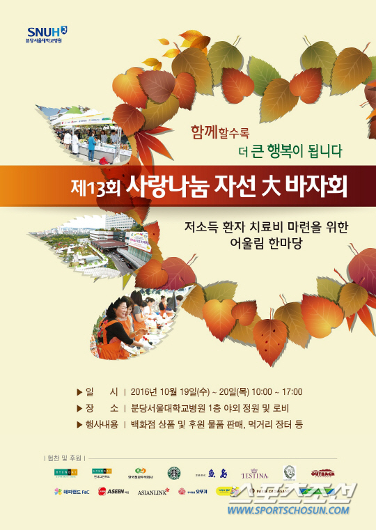 분당서울대학교병원(원장 전상훈)은 오는 19-20일 양일간, 병원 1층 야외 정원 및 로비에서 저소득 환자 치료비 마련을 위한 제 13회 자선바자회를 개최한다고 밝혔다.