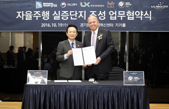 BMW 그룹 코리아는 19일 경기 창조경제혁신센터 기가홀에서 자율주행 기술 협력을 위한 '판교 창조경제밸리 업무협약서(MOU)'를 체결했다.