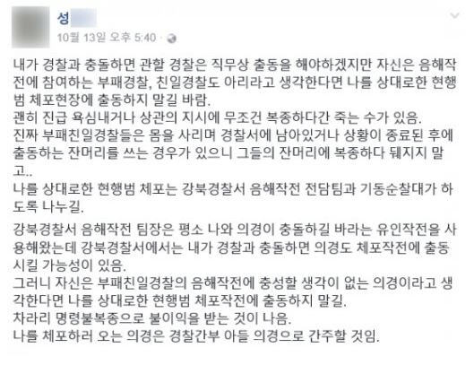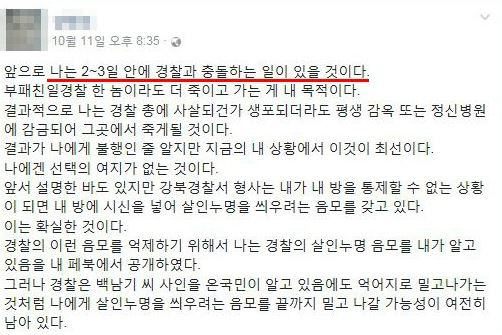 피의자 성모(45)씨는 지난 11일 자신의 페이스북에 '앞으로 나는 2~3일 안에 경찰과 충돌하는 일이 있을 것이다. 부패친일경찰 한 놈이라도 더 죽이고 가는 게 내 목적'이라는 글을 올렸다. '결과적으로 나는 경찰총에 사살되든가 생포되더라도 평생 감옥 또든 정신병원에 감금되어 그곳에서 죽게 될 것이다. 결과가 나에게 불행인 줄 알지만 지금의 내 상황에서 이것이 최선이다. 나에겐 선택의 여지가 없는 것"이라는 글로 범죄를 예고했다. 그는 "강북경찰서 형사는 내가 내 방을 통제할 수 없는 상황이 되면 내 방에 시신을 넣어 살인 누명을 씌우려는 음모를 갖고 있다. 경찰의 이런 음모를 억제하기 위해 나는 경찰의 살인누명 음모를 내가 알고 있음을 내 페북에서 공개했다"고 덧붙였다. 13일에도 한차례 더 글을 올렸다. 내가 경찰과 충돌하면 관할 경찰은 직무상 출동을 해야하겠지만 자신을 음해작전에 참여하는 부패경찰, 친일경찰도 아니라고 생각한다면 나를 상대로한 현행범 체포현장에 출동하지 말길 바람. 괜히 진급 욕심내거나 상관이 지시에 무조건 복종하다간 죽는 수가 있음이라는 경고 메시지를 남겼다.