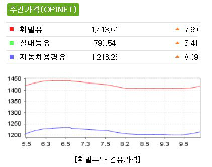 이에따라 석유공사는 다음 주 휘발유 가격은 1429원, 경유 가격은 1221원으로 상승할 전망이라고 예상했다.