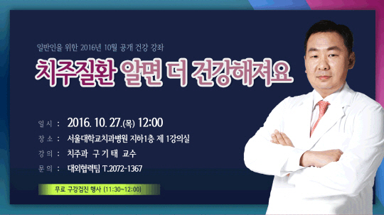 서울대학교치과병원(원장 허성주)은 27일 낮 12시 치과병원 지하 1강의실에서 '치주질환 알면 더 건강해져요'를 주제로 공개 건강강좌를 개최한다고 밝혔다.