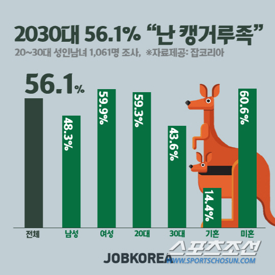 취업포털 잡코리아는 성인남녀 1061명을 대상으로 '캥거루족' 체감정도를 조사한 결과 자신을 캥거루족이라 생각하는 응답자가 절반을 넘는 것으로 나타났다고 25일 밝혔다. 캥거루족은 독립할 때가 됐음에도 경제적으로 또는 인지적으로 부모에게 의존해서 살고 있는 사람들을 일컫는다.