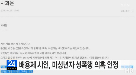 배용제는 26일 자신의 블로그에 "오랫동안 예고에서 강사로 재직하면서 시를 가르치기도 했다"며 "시를 가르친다는 명목하에 수많은 성적 언어로 희롱을 저지르고 수많은 신체 접촉으로 추행을 저질렀다. 상처받고 아픈 시간 보냈을 아이들에게 머리 숙여 용서를 구한다"고 밝혔다.