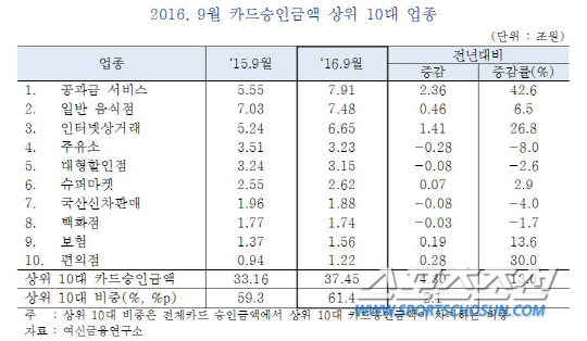 업종별로는 부동산 중개업종의 카드승인액이 1164억원으로 전년 동월대비 55.7% 늘었다.