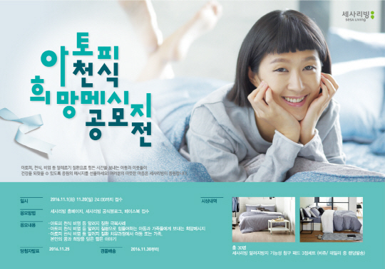 이에 세사리빙은 캠페인의 일환으로 '아토피?천식 희망메시지 공모전'을 진행한다. 응모 내용은 아토피, 천식, 비염 등 알러지 질환 극복 사례나 알러지 질환으로 고통 받는 아동과 가족들에게 보내는 희망메시지 등으로 오는 11월 1일부터 20일까지 세사리빙 홈페이지(www.sesaliving.com), 블로그, 페이스북을 통해 접수 가능하다.