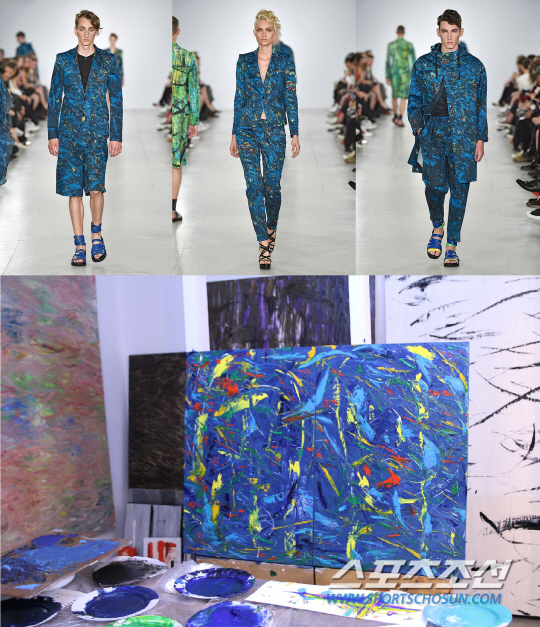 늘 직접 그린 작품에서 모티브를 얻어 컬렉션을 해요. 추상화를 그리죠. 뒤에 있는 게 지난 F/W 시즌 그림이에요.