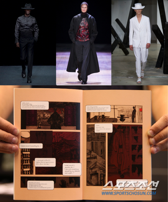 한국 사극을 보면 도령들이 도포 자락에 삿갓을 얼굴 안보이게 쓰고 활보하기도 하죠. 그래서 파리 쇼에서 몇 시즌을 모자를 만들어서 얼굴을 살짝 가리게 연출해봤어요. 근데 외국에서 반응이 엄청나서 많이 따라했어요. 흔히 보이는 눈을 가리는 스타일의 원조는 송지오 옴므에요. 그게 바로 도령 모티브죠. 어떻게 보면 카리스마의 상징인 서구 영화의 악당 같기도 하고. 이런 도령 컨셉이 한국의 엘레강스라고 생각해요.