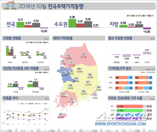 한국감정원은 31일 '10월 전국 주택가격동향 조사' 결과 지난달 대비 매매가격은 0.17%, 전월세통합은 0.07%, 전세는 0.14% 각각 상승했다고 밝혔다. 반면, 월세가격은 0.02% 하락한 것으로 나타났다.