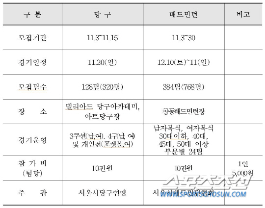 배드민턴 대회는 오는 30일까지 참가신청을 받고 12월 10일부터 11까지 양일간 창동 배드민턴장에서 열린다. 급수와 연령에 따라 384개 팀(768명)의 경기가 진행되며 직장 클럽 동호인이면 참가 가능하다.