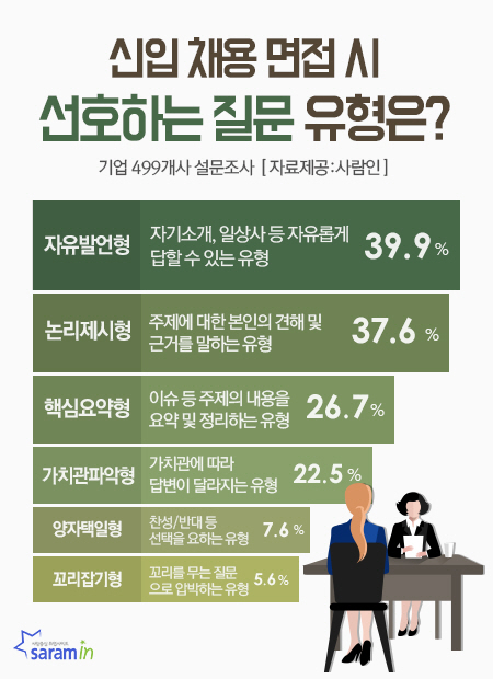 취업포털 사람인은 기업 인사담당자 499명을 대상으로 '선호하는 질문 유형'을 조사한 결과, 자기소개, 일상사 등 자유롭게 답할 수 있는 '자유발언형'이 39.9%(복수응답)로 1위를 차지했다고 1일 밝혔다.