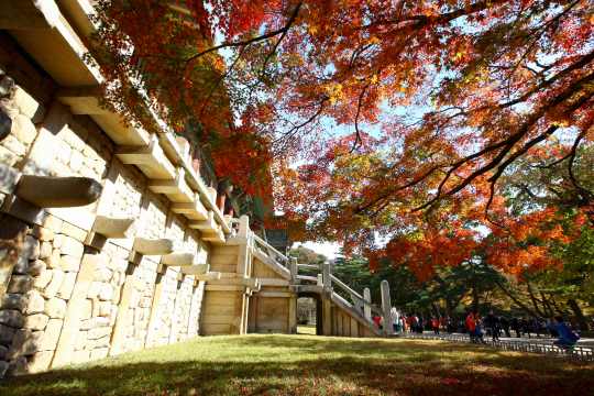 신라문화, 경주관광의 대표적 코스는 단연 불국사다. 불국사는 '이상적인 부처님의 나라'를 표방하는 사찰로, 국내에서 국보를 가장 많이 거느린 절집이다. 경내에는 다보탑과 석가탑(불국사 삼층 석탑), 청운교와 백운교 등 우수한 불교문화 유산들이 한 가득이다. 일주문-천왕문을 지나면 대석단이 나선다. 청운교, 백운교와 연화교, 칠보교로 이뤄진 멋진 석조 구조물이다. 11월이면 대석단 주변에는 화려한 단풍이 드리워져 운치를 더한다. 이들 다리를 지나 자하문을 통해 부처님의 세계로 향한다.