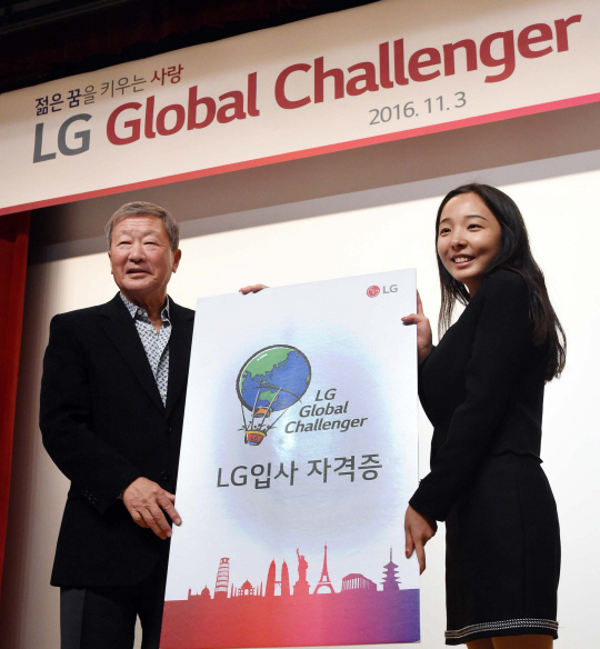 구본무 LG그룹 회장이 3일 여의도 LG트윈타워에서 열린 'LG글로벌챌린저' 시상식에 참석해 창의적이고 혁신적인 도전을 마치고 돌아온 34개 팀 136명의 대학생들을 격려했다.