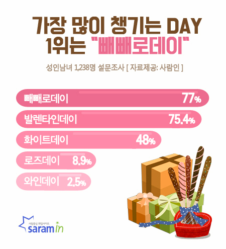 발렌타인데이·화이트데이 등 각종 '데이(Day) 기념일'들 가운데 성인남녀가 가장 많이 챙기는 날은 '빼빼로데이'인 것으로 조사됐다.