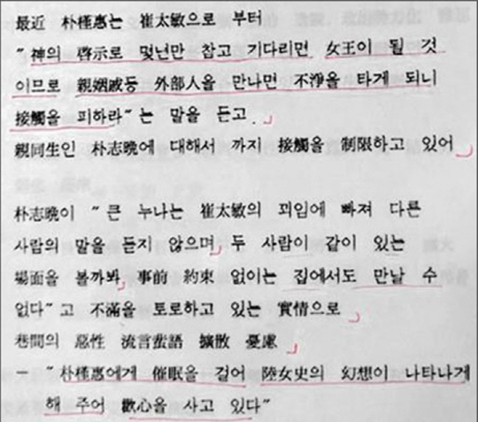 조선일보가 이날 공개한 문건에 따르면 최태민이 동생 박지만 등 가족은 물론 친인척의 접근 및 접촉을 철저히 봉쇄했음을 알 수 있다. "최근 박근혜는 최태민으로부터 '신의 계시로 몇년만 참고 기다리면 여왕이 될 것이므로 친인척 등 외부인을 만나면 부정을 타게 되니 접촉을 피하라'는 말을 듣고 친동생인 박지만에 대해서까지 접촉을 제한하고 있어 박지만이 '큰누나는 최태민의 꾀임에 빠져 다른 사람의 말을 듣지 않으며, 두 사람이 같이 있는 장면을 볼까봐 사전 약속 없이는 집에서도 만날 수 없다'고 불만을 토로하고 있는 실정으로 항간의 악성 유언비어 확산 우려라고 쓴후 유언비어로 '박근혜에게 최면을 걸어 육여사의 환영이 나타나게 해주어 환심을 사고 있다'고 씌어 있다. <스포츠조선닷컴>