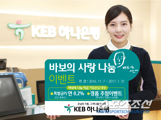 KEB하나은행은 7일 이웃과 함께 나누는 따뜻한 연말연시를 보내자는 의미로 '바보의 사랑나눔 이벤트'를 실시한다고 밝혔다.