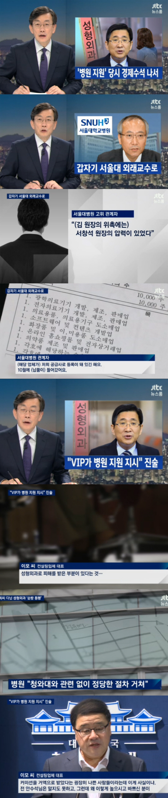해당 의원의 의혹은 이뿐만이 아니었다. '뉴스룸'은 "해당 의원 원장이 서울대병원 강남지점의 외래 교수가 됐다"며 "박근혜 대통령 주치의였던 서창석 교수가 서울대 원장으로 부임한 이후였다"고 보도했다. 이상한 것은 서울대병원 강남에는 성형외과가 없다는 것. 매체는 서울대병원 고위직 말을 인용해 "당시 외래교수 채용은 서창석 원장의 압력이 있었다"고 보도했다. 또한 "서울대병원에 최순실 모녀가 드나들던성형외과의원 원장의 친인척이 운영하는 의료기기가 납품된 것도 확인했다"고 전했다.