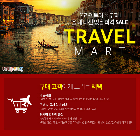 쿠팡이 온라인투어와 손잡고 인기 해외여행지를 선별해 파격적인 혜택과 함께 선보이는 '트래블마트'를 다음달 2일까지 진행한다.