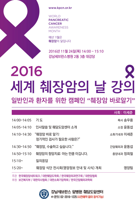 세계 최장암의 달(11월)을 맞아 열리는 이번 강좌에서는 췌장암의 정기검사, 수술, 항암치료에 대한 강연이 이어진다. 이번 강좌에는 강남세브란스병원 소화기내과 이세준 교수, 간담췌외과 윤동섭 교수, 종양내과 정희철 교수가 강연한다. 강좌 후에는 췌장암 식단 전시회(영양정보 안내 및 시식)도 진행된다.