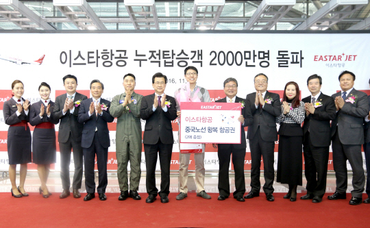 이스타항공 누적 탑승객 2000만명 달성은 지난 15일 청주공항에서 이뤄졌다. 이스타항공은 청주공항에서 이상직 이스타항공 회장, 이시종 충북도지사, 윤재길 청주부시장 및 관계자들과 임직원들이 참석한 가운데 2000만번째 탑승고객 돌파 축하 행사를 가졌다.