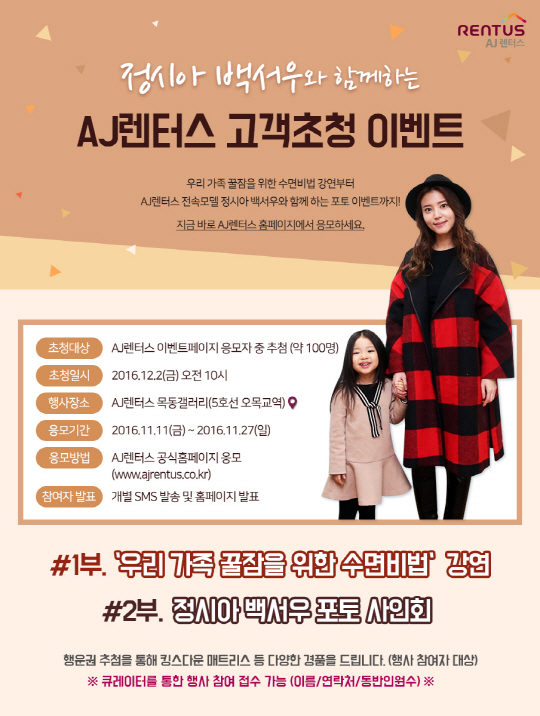AJ렌터스는 가족 수면 건강에 관심이 높은 고객들에게 올바른 수면법을 알리고자 특별한 고객초청 이벤트를 마련하게 됐다. 이번 행사는 김종수 AJ렌터스 대표의 환영 인사로 시작해 1부는 서울수면의원의 수면전문가가 '우리가족 꿀잠을 위한 수면비법'을 주제로 강연하며, 2부는 SBS 오마이 베이비에 출연해 인기를 모았던 AJ렌터스 전속모델 배우 정시아와 딸 백서우를 초청해 포토 사인회를 진행한다.
