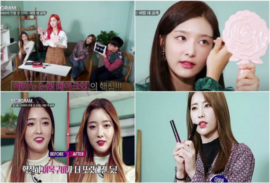 이날 다이아는 자신들이 숙소에서 직접 사용하는 뷰티템들을 하나하나 소개했다. 특히 희현은 메이크업 시 속눈썹을 가장 중요하게 생각한다며 섬유질 마스카라를 이용해 마치 속눈썹 연장시술을 받은 듯한 볼륨감 있는 인형 속눈썹을 완성했다.