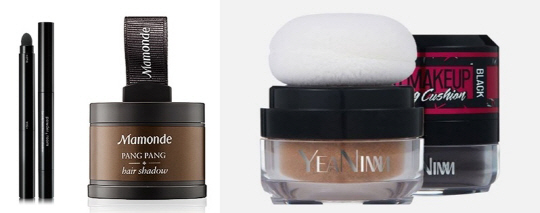 헤어라인 셰도우로 이마가 넓거나 모양이 예쁘지 않은 헤어라인을 채우면 한결 어려보이는 동안 이미지를 연출할 수 있다. 쏘내추럴 헤어라인 커버 셰도우는 한쪽은 스틱, 한쪽은 스펀지로 되어있어 좁은 부분에 비벼서 사용하는 제품이다. 휑한 가르마나 숱이 부족한 부분이 넓은 경우를 위한 제품도 있다. '마몽드' 헤어팡팡 셰도우는 팩트타입의 셰도우와 쿠션으로 이루어진 헤어라인 커버 제품이다. 더불어 예님 헤어 볼륨 셰이딩 쿠션은 100% 콩 섬유질로 만든 볼륨 파우더가 두피가 숨쉬는데 방해 없이 가늘고 숱 적은 헤어의 볼륨을 단시간에 끌어올려주고 훤히 드러난 두피와 가르마 라인 등을 자연스럽게 커버해주는 제품이다. 파우더가 담긴 케이스와 퍼프가 일체형인 제품으로 쿠션을 가볍게 툭툭치는 것만으로 풍성한 헤어 연출이 가능해 사랑받는 제품이다. 또한 일반스프레이를 사용하는 기존 흑채와 달리 딱딱함 없이 부드럽고 자연스러운 헤어연출이 가능하게 하는 전용 스프레이가 있는 것이 특징이다.